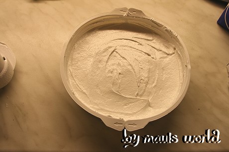 Nun wird das Pulver für die Füllung und die 125 ml kalte Milch verrührt. Am besten soll es mit einem Stabmixer gehen. Ich hab meine Knetmaschine genommen und hab das 3 min. laufen lassen, bis eine schöne cremige Masse entsteht. Diese verteilt ihr nun auf den Boden.